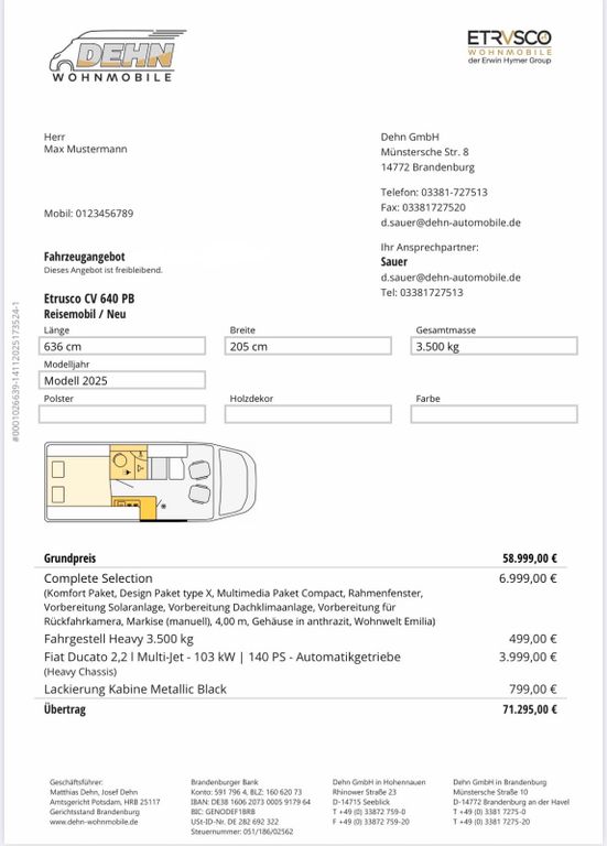 Das Fahrzeug ist professionell aufbereitet und wurde technisch und optisch durch einen unabhängigen Sachverständigen geprüft. Durch unsere hauseigene Vertragswerkstatt haben wir bereits notwendige technische und optische Arbeiten durchgeführt, um Ihnen das Fahrzeug in einem bestmöglichen Zustand präsentieren zu können. Bei Bedarf rüstet unsere Meisterwerksatt Ihnen nahezu jedes Wunschzubehör nach, wie z.B. Anhängerkupplung, Markise, Solar, Marderabwehr, Winterräder und vieles mehr. Gerne bieten wir Ihnen eine Gebrauchtwagengarantie und einen bundesweiten Zulassungsservice an. Sollte der Weg zu uns aufwendig sein, können wir das Wunschfahrzeug zu Ihnen überführen. Sprechen Sie unser Verkaufsteam dazu gerne an.