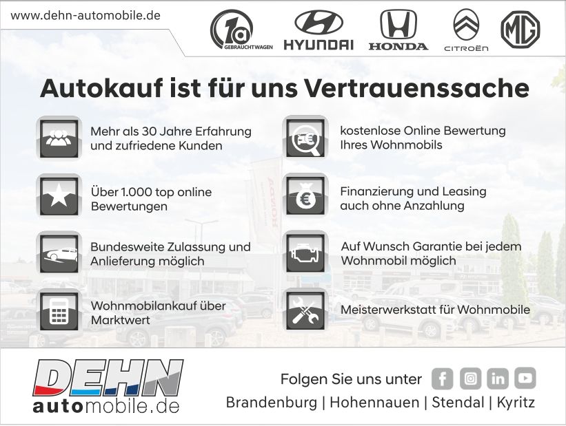 Entdecken die Welt der grenzenlosen Freiheit mit Wohnmobile Dehn in Brandenburg und Stendal. Besuche uns noch heute und lass Dich von unserem umfangreichen Angebot inspirieren.