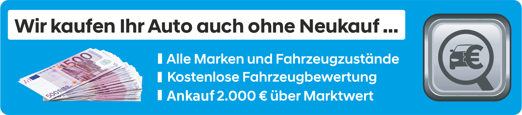 Inzahlungnahme/Ankauf Ihres Gebrauchtwagens oder Wohnmobil mit kostenloser Fahrzeugbewertung ist bei uns ausdrücklich erwünscht. Wir bieten Ihnen gern ein Finanzierungs- oder Leasingbeispiel, maßgeschneidert auf Ihre Bedürfnisse an und lösen Ihre bestehende Finanzierung ab.
